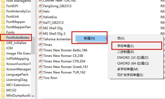 6、回到“FontSubstitutes”右击空白处点击“新建”,选择“字符串值”,如下图所示。