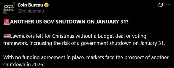近期数据显示,加密货币市场表现不佳,且对新形势高度敏感。然而,一些投资者将加密货币视为应对财政失灵的避险工具,尤其是在经济停摆与市场预期宽松货币政策同时出现的情况下。