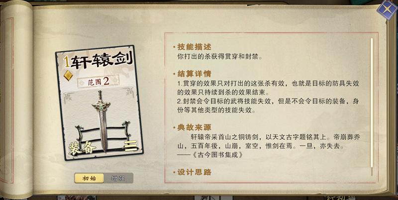 轩辕剑可使目标防具失效(直到杀的效果结束),并且令目标武将技能失效,可以更稳定的打出效果,但是敌方没防具或者技能并没有特别需要封禁的时,这就是个多余的武器。
