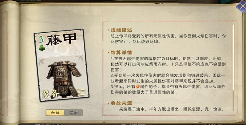 藤甲可防止所有的无属性伤害,也是保护能力拉满,就是比较怕火焰伤害(烈火焚城、火杀)。正因为藤甲怕火杀,所以遇到有藤甲的,就用火杀共计对方吧!普通杀就别出了。