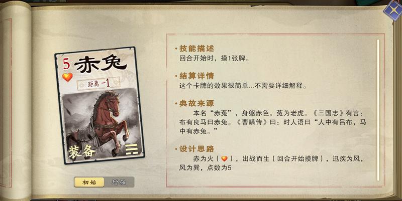 赤兔在回合开始时就能摸1张牌,效果与爪黄飞电类似。爪黄飞电是防御马(+1距离),而赤兔更侧重于进攻(-1距离),可适当时机使用,与对方拉开距离。
