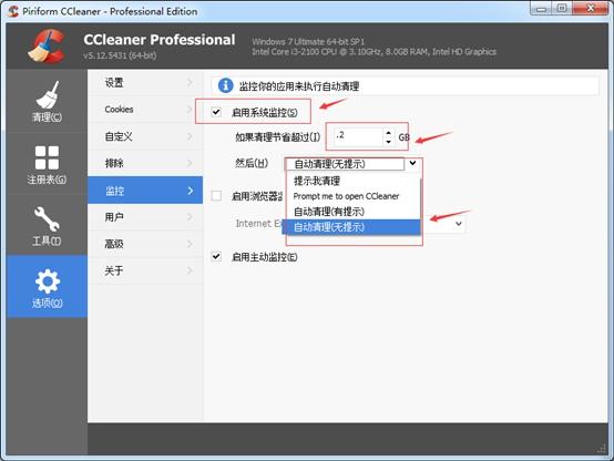 2、然后找到右侧中的"启动系统监控",将其勾选上,在"如果清理节省超过"中设置合适的数值,点击下方"然后"中的选项框下拉按钮,最后根据个人需求选择合适的选项就可以了。