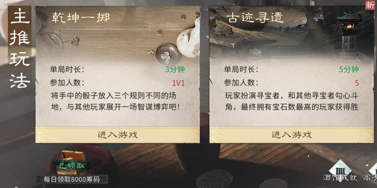 主要分为2种玩法:【乾坤一掷】和【古迹寻遗】,参加这2个玩法都需要消耗筹码,每日都可以免费领取8000的筹码,也可以在筹码商城中进行购买,但都有次数限制。