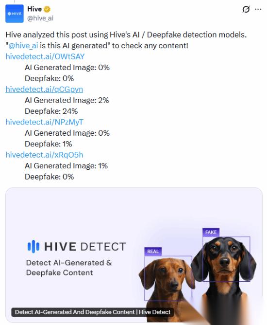 与此同时,AI 图像检测工具 “Hive” 的官方账号也在 X 平台作出回应,公布了对任天堂此次发布的 4 张宣传图的检测结果。结果显示,尽管辛克莱尔出镜的那张图片被检测出有 24% 的概率为深度伪造技术制作,属于相对较高的数值,但其余 3 张图片的 AI 生成概率均为 0~2%,处于极低水平。Hive 方面据此认为,这些图片使用 AI 的可能性较低,变相为任天堂进行了辩护。