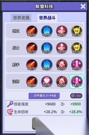 完成以上步骤就可以开始点【世界战斗】了,建议先将四职业的前三个强化都点到10级将所有科技解锁,之后根据自己阵容去点即可,什么时候把种子汽油拉满,什么时候点资源地没有最优解,上面的步骤也不需要严格遵守。