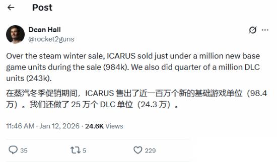 由《DayZ》之父Dean Hall领衔的RocketWerkz工作室宣布:其旗下的PVE生存游戏《翼星求生》在冬促的三周内,狂卖了98.4万份。甚至连DLC都跟着卖出了24.3万份。