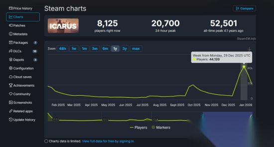 游戏从原价35美元直接降到了3.50美元(国区12.8元),这一招直接让游戏的日活爆了。根据SteamDB数据,游戏在12月的同时在线人数峰值飙升至44,120 人(11月仅为9000人)。这是除2021年12月首发以外的历史最高记录。