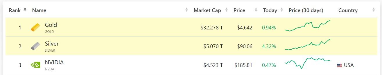 这种结构性紧缩,即需求超过采矿和回收能力,使得白银成为市值第二大的资产,超过了英伟达,现货市值达到5.05万亿美元。这种白色金属目前仅次于占据主导地位的黄金。