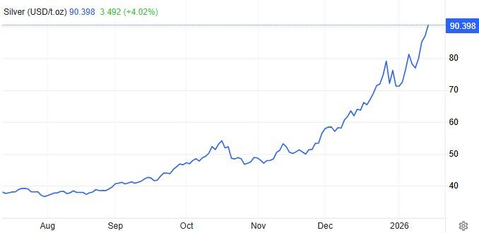 工业需求推动白银价格历史性飙升,突破90美元大关