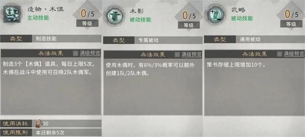第一行:主动技能制造木偶,用于卡位战术,推荐点满;被动技能【木影】概率较低,不推荐;被动技能【武略】提升策书上限,建议优先点满。