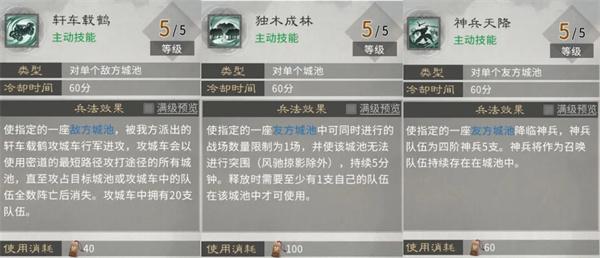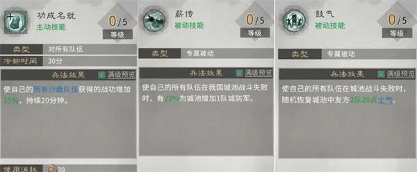 第三行:效果包括提升战功获取、增加城防军、恢复队友士气。主动技能满级战功加成25%,收益一般,看需求点;【薪传】增加城防军容易阻碍友军行动,不推荐;【鼓气】士气恢复可根据团队需求选择。