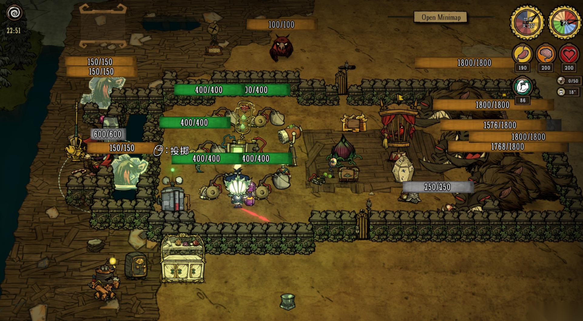 使用时需掌握这些技巧:一是状态管理,激活后无目标一段时间会进入待机,激活状态每天耗电1单位,待机时0.5单位,每次攻击消耗1/12单位电力,可通过左键点击或称手遥控器激活;二是攻击特性,不会伤害切斯特、格罗姆等友好生物,对暗影生物无自动攻击判定,需手动用遥控器指定目标;三是搭配策略,推荐“1发电机+6投石机”的摆法,形成无死角防御网,应对猎犬潮、巨鹿等Boss时效果极佳。