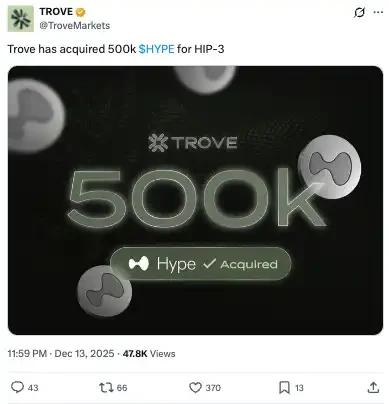 12 月中旬,Trove 宣布斥资超 2000 万美元收购了 50 万枚 HYPE 代币,以满足 HIP-3 的集成要求。紧接着测试网积分计划开启,平台交易量在两周内突破 100 万美元,一切都在向着预期的方向发展。直到...