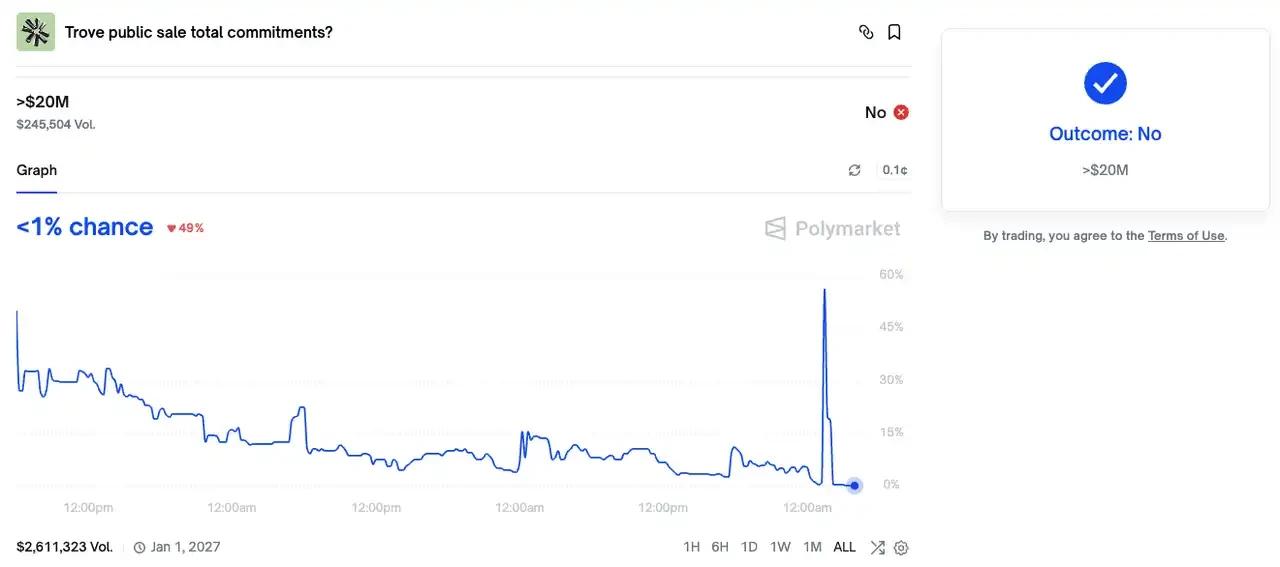 此时距离代币发售截止仅剩不到两小时(UTC+8),Polymarket 上关于「Trove 代币发售总募集金额大于 2000 万美元」的预测盘口概率已接近归零。