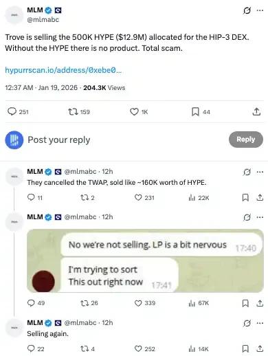 1 月 17 日,Trove 突然宣布放弃 Hyperliquid,转而在 Solana 上发行代币。对于一个一直打着 Hyperliquid 生态旗号募资的项目,这无异于釜底抽薪。