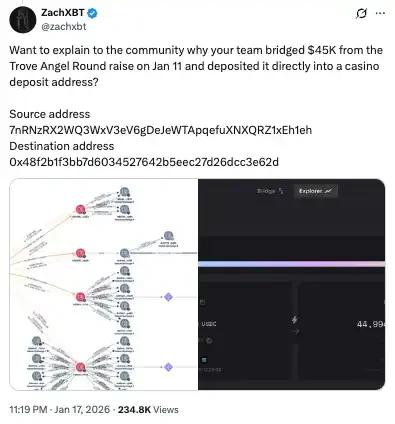 知名链上侦探 ZachXBT 披露,Trove 团队向 @TJRTrades 支付了高达 4.5 万美元的营销费用,并直接打入该 KOL 的菠菜网站充值地址