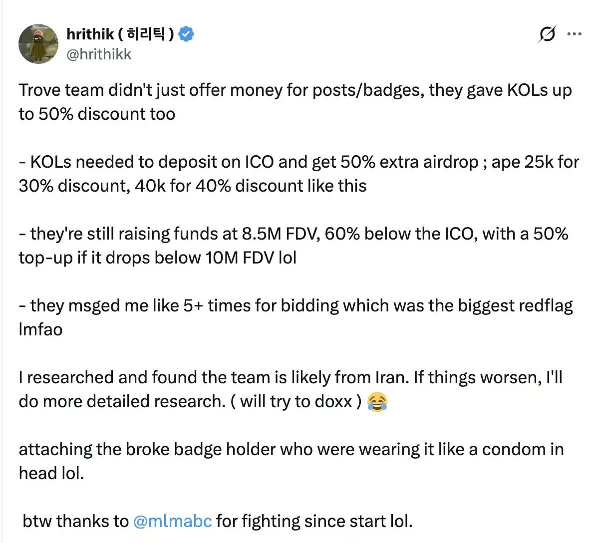 KOL @hrithikk 表示,Trove 团队不仅给 KOL 提供了丰厚的营销费用,还私下提供了低至 850 万美元估值的代币额度,折扣高达 60%,并附带巨额空投奖励。目前 Trove 仍在在以低价出售份额,并超过 5 次向他询问是否能够投资 Trove。