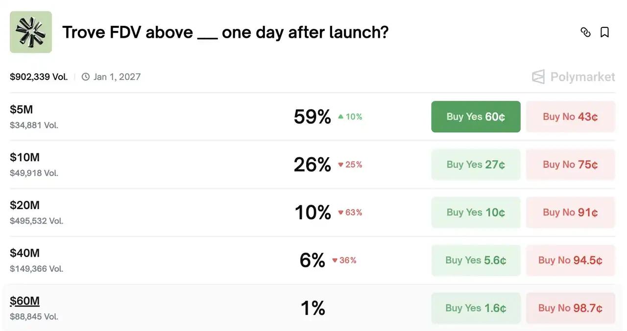 Trove 将在东八区 1 月 20 日 1 点 TGE,Polymarket 的盘口数据显示,以预售估值计算,TROVE 代币有 90% 的概率破发。