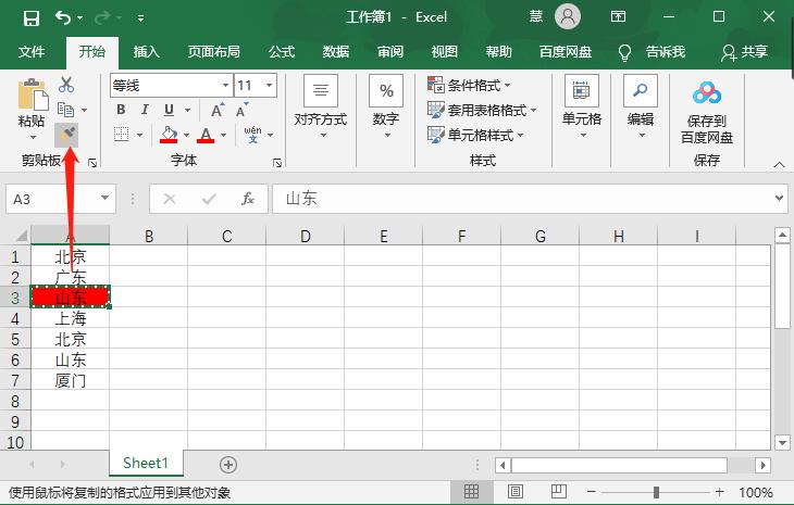 2、将数据的背景颜色填充为红色之后,双击【格式刷】功能,出现绿色的虚线框;