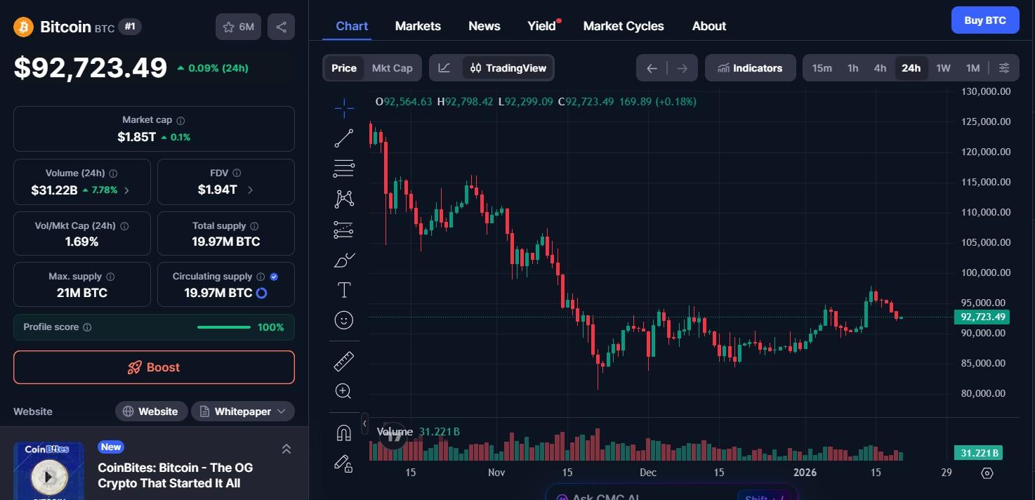 比特币价格(BTC):92,784.63 美元,上涨 0.21%,电视:314.8 亿美元。
