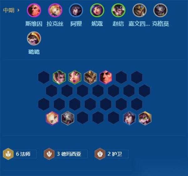 可转六法打工阵容,配合德玛西亚和护卫单位稳住场面。