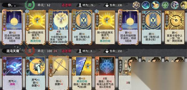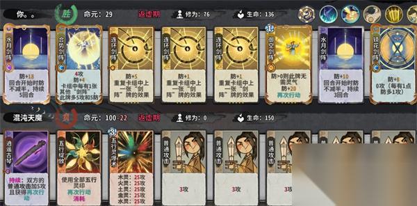 3.核心卡牌:合势剑阵,由于合势剑阵的被动效果,当卡组中八张都为剑阵时,满级合势剑阵可打出高达39/39攻防,利用连环剑阵重复效果配合镜花剑阵收尾,在有剑阵守护情况下四动可以秒杀混沌天魔,可以抵挡住五行灵爆术的爆发。