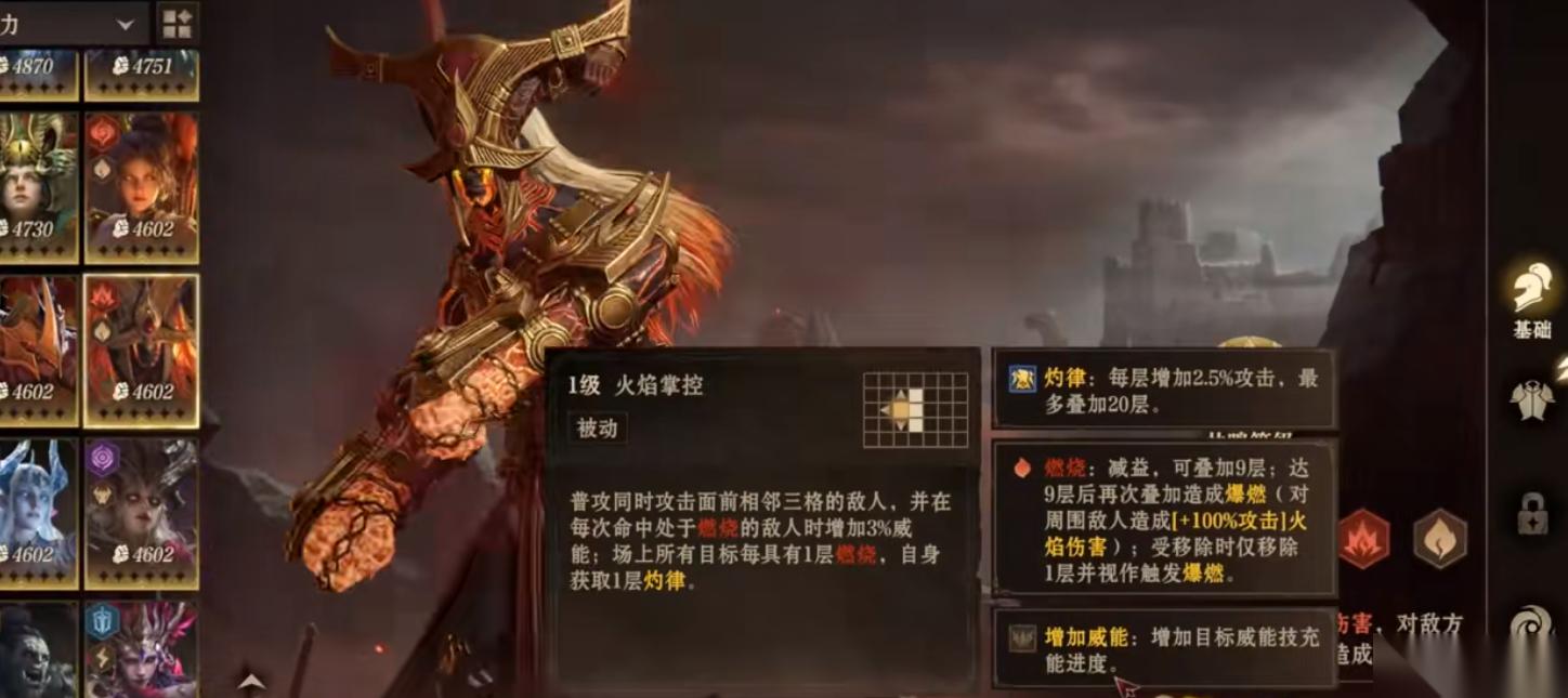火拳的被动技能是火焰掌控,能够让咱们的普攻变成群体攻击,并且命中敌人之后还能直接造成燃烧的效果,可以增加威能和攻击力,从而加快输出的节奏。咱们的战技是熔岩之怒造,释放以后会造成一个范围伤害,并且还会给目标施加点燃,给后续的燃烧和爆燃做好铺垫。威能技能是燃尽一切,释放之后会对全体目标造成火焰伤害,并且也是会施加引燃的,还可以让一半燃烧直接触发爆燃,除此之外,还会以比奥及的目标为中心,造成额外的火焰伤害。每触发一次爆燃之后,就会额外造成百分之一百的伤害。