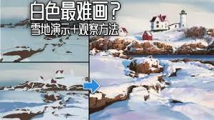 4. 雪地部分用白色颜料大面积涂抹,然后用浅蓝色轻轻地在雪地边缘晕染,表现出雪地的阴影和冷色调。