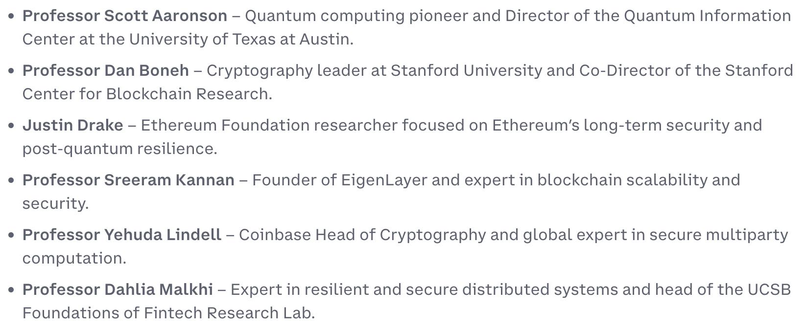 在周三(1月21日)发布的博客文章中,Coinbase介绍了由学术界和行业专家组成的咨询委员会成员,包括量子计算、密码学、分布式系统和区块链安全领域的专家,以及来自主要大学、Ethereum生态系统和Coinbase的高级研究人员。