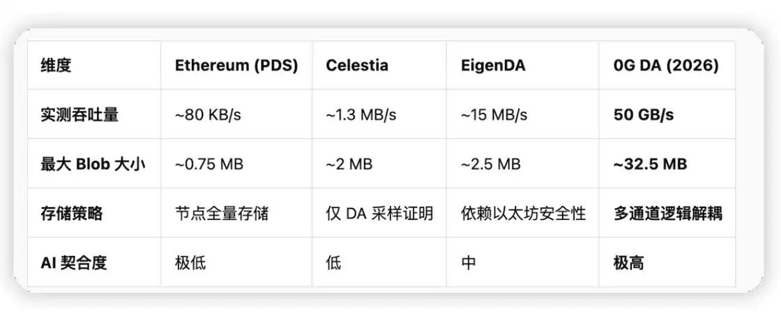 0G DA 在吞吐量上的突破,直接定义了去中心化 AI 操作系统的性能边界。下表展示了 0G 与主流 DA 方案的技术参数对比: