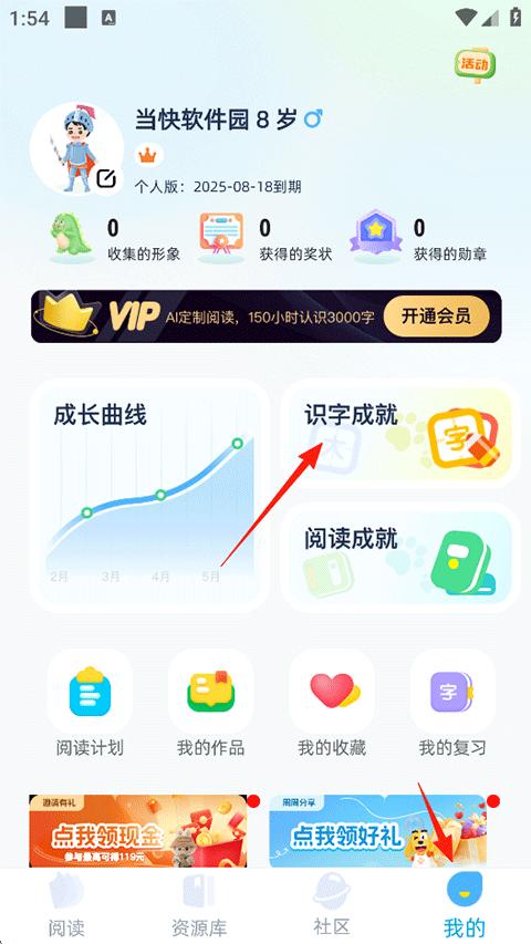 1、打开适趣AI阅读APP,点击【我的】-【识字成就】;