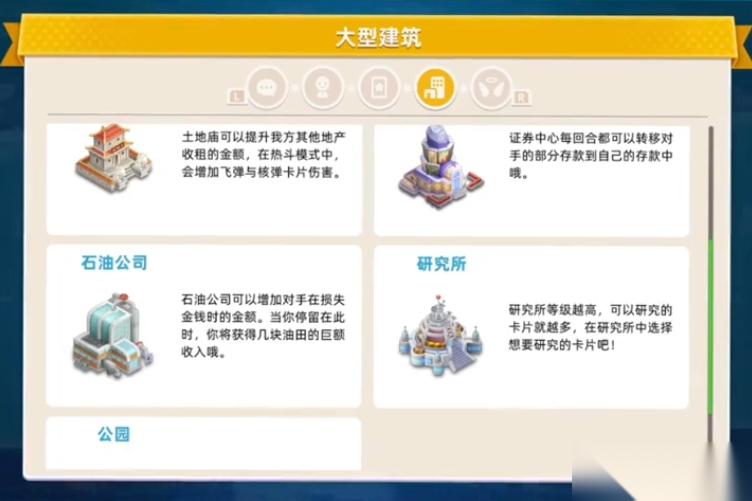 中后期石油公司就是一个能显著拉开经济差距的建筑。它不仅能在你停留时给你带来油田的巨额收入,它能增加对手在损失金钱时的金额。这意味着对手无论是交过路费、使用卡片还是进行其他消费,都要额外支付一笔能源附加费,减益效果非常明显。如果能建成一个高等级的石油公司,对对手的压制力会非常强。另一个值得关注的大型建筑是研究所,它是一个特殊的功能性建筑。研究所的等级越高,可以研发的卡片就越多、越高级。比如一级研究所可以研究机器人实现远程建造,三级能研发遥控骰子控制步数,而四级传送卡和五级核弹卡更是能直接改变战局的强力道具。研究所也很容易成为被对手针对的目标,所以建造时机和位置需要谨慎选择。