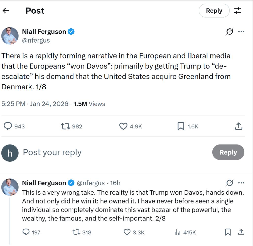 知名历史学家尼尔·弗格森1月24日在社交媒体X上发表最新观点,特朗普近期在达沃斯论坛上高调炒作“购买格陵兰岛”议题,实则是一场精心策划的战略佯攻。