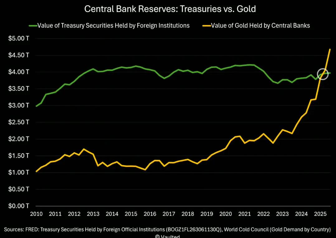 自1996年以来,各国央行持有的黄金总价值(估计约为4.6万亿美元)首次超过了其持有的美国国债价值(接近3.9万亿美元)。这一逆转凸显了货币当局对硬资产而非主权债务日益增长的偏好。