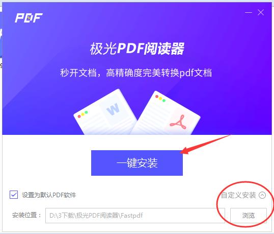 2、选择自定义安装,选择D:3下载极光PDF阅读器Fastpdf,点击一键安装即可