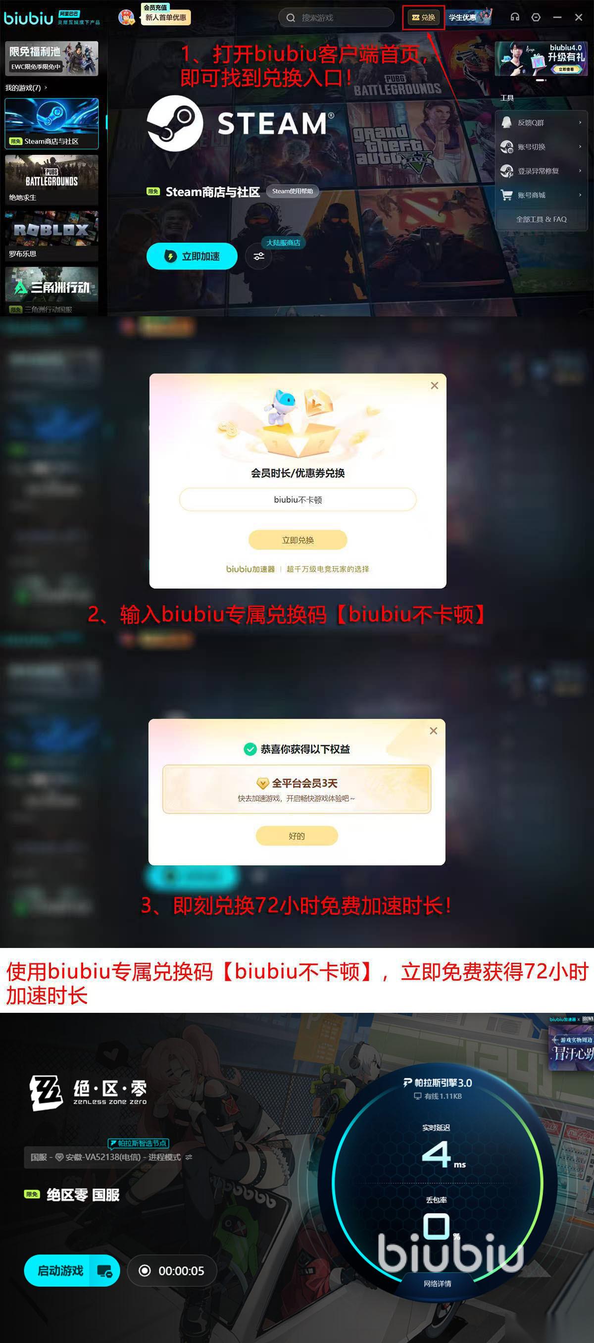 在使用了biubiu加速器后,大家在玩绝区零后,画面的掉帧将大幅减少,卡顿延迟的情况将变少,最重要的闪退也会消失。正在被这些问题烦的绝区零玩家 ,现在可领取免费时间体验,两个步骤,注册后会先得到系统送的24小时,这是第一个时间,另外还有个打开首页“兑换”按钮,然后填写或输入【biubiu不卡顿】口令后,还能再得到72小时免费时间,这两个时间累计后会有96小时。