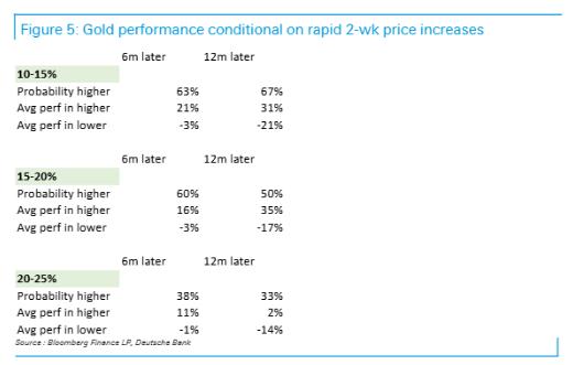 德银认为随着黄金两周涨幅的加速,金价进一步上涨的概率呈现下降趋势。