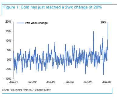 追风交易台消息,1月29日德意志银行分析师Michael Hsueh指出,黄金两周涨幅20%是一条历史分界线,它区分了金价后续是继续冲锋还是就地休整。