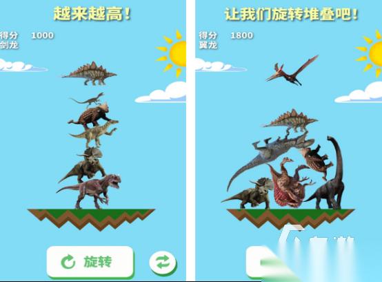 玩法非常与众不同,将恐龙堆叠在一起的方式,避免从平台上掉落下来以后,就能够让玩家建造更高的塔。涵盖很多类型的恐龙,由于它们之间的体型不同,所以在堆叠的过程当中,也要合理的根据每一个恐龙的体型,通过正确点击屏幕,旋转恐龙的方式,有机会获得高分数。要有很好的判断能力,即使在单机的状态下也能畅玩。