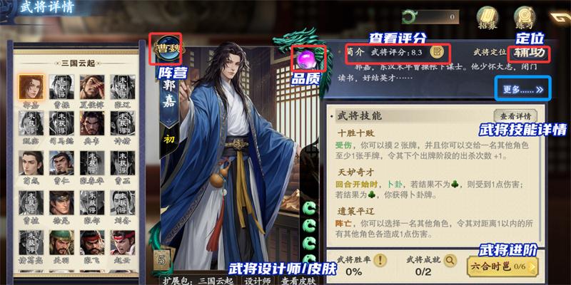 设计师:点击立绘下方的设计师,可以查看武将设计师、文案、绘画、原画、台词配音等人员名单。