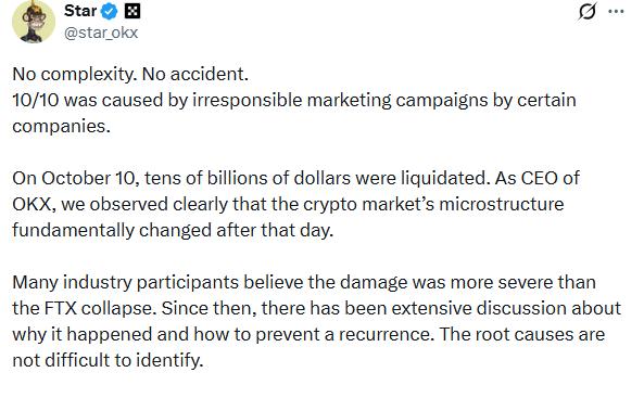 OKX CEO 将 10 月 10 日的加密货币崩盘归咎于币安的收益推广活动。