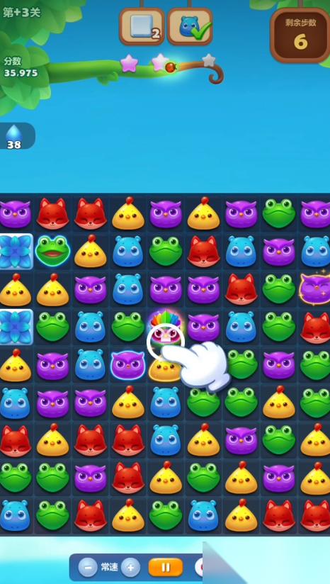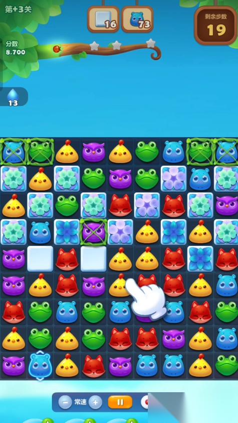 具体的通关技巧方面,开局后应优先寻找或制造竖直直线特效或魔力鸟来突破藤蔓。当局面下半部分难以形成所需特效时,应集中精力在上半区域进行消除,尝试构建特效。每一步操作都要精打细算,因为步数有限,要致力于创造连消和连锁反应的机会,这样既能高效消除目标,也能获得更高分数。消除时务必记住两个任务目标,在攻击雪块的同时,要有意识地多消除小河马,避免步数用完时某一项任务未能完成。