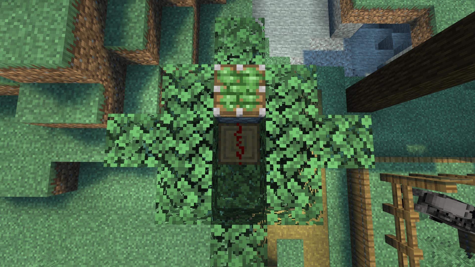 我们先把树叶去掉一些,在树干上放置红石粉,在红石粉正前方放置一个粘性活塞