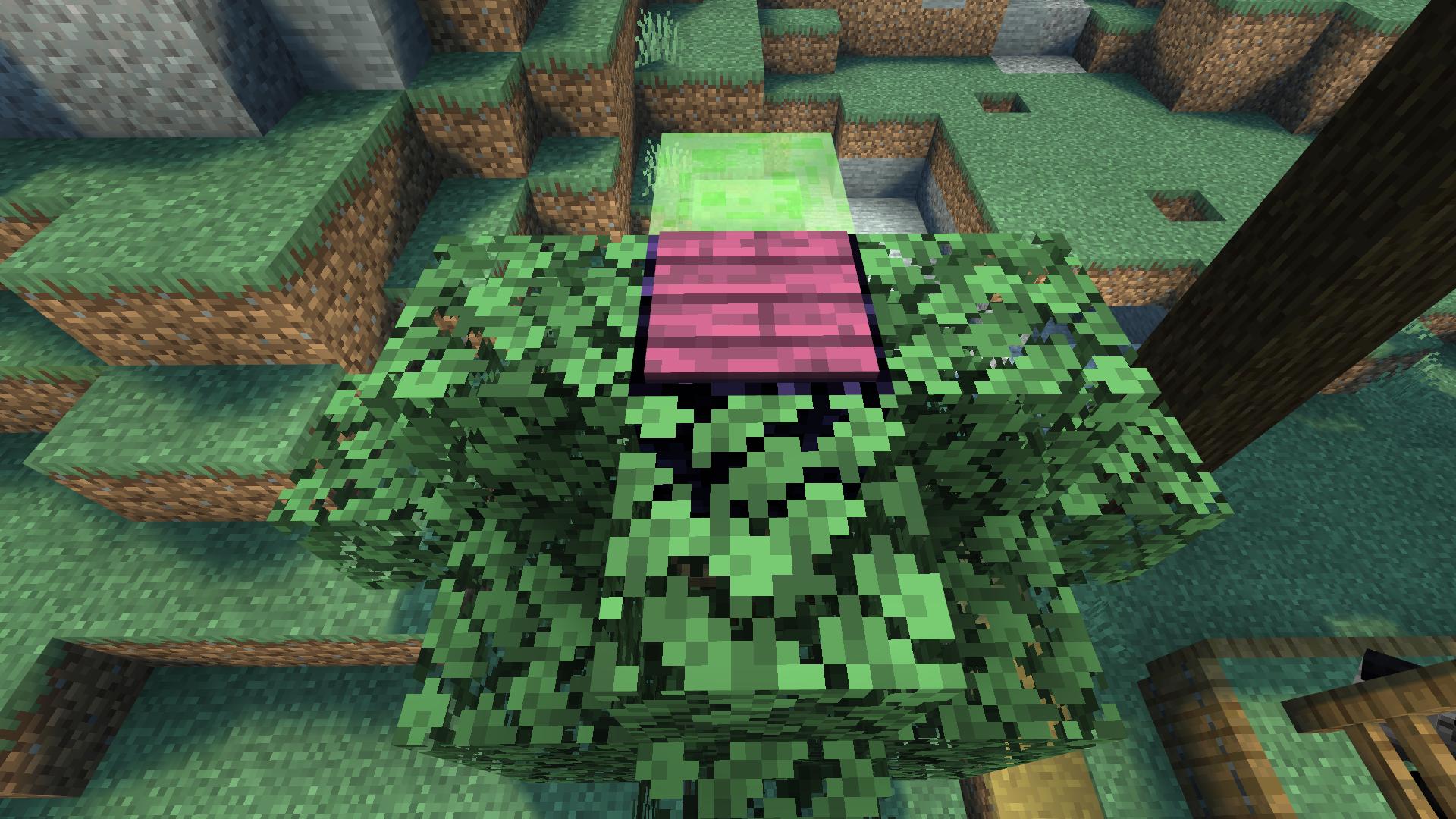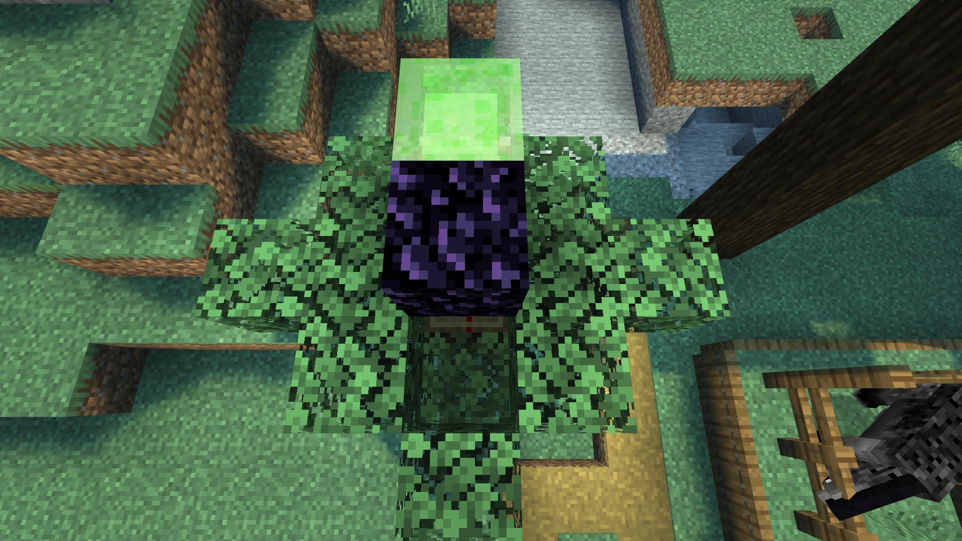 在粘性活塞上摆放一个粘液块,黑曜石悬空在红石粉的上方挨着粘液块摆放,把压力板放置在黑曜石上方,再把树叶恢复好,第一颗弹跳树就布置好了