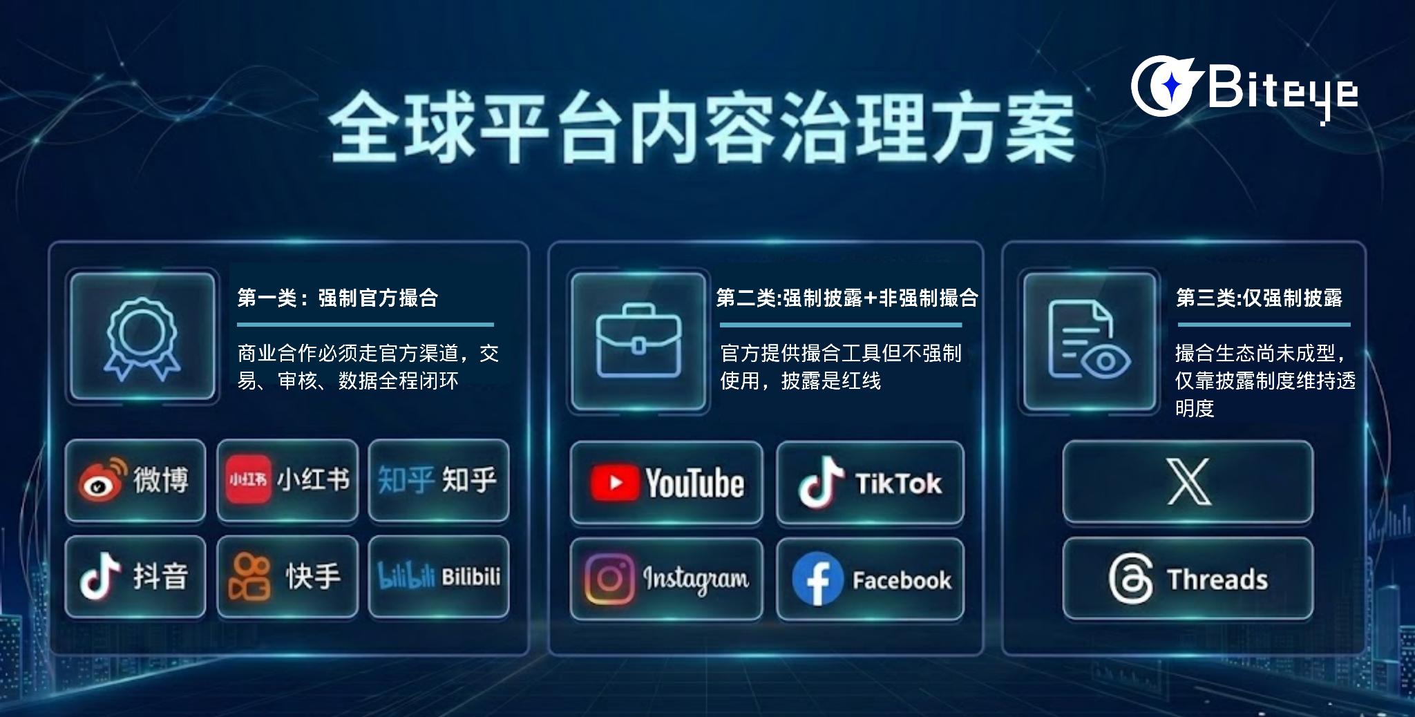 把 X 的新规放在全球平台演进史里看,它并不突然,只是补上了一块迟来的拼图。从治理模式来看,全球内容平台可以分为三类:强制官方撮合型、强制披露 + 非强制撮合型、仅强制披露型。