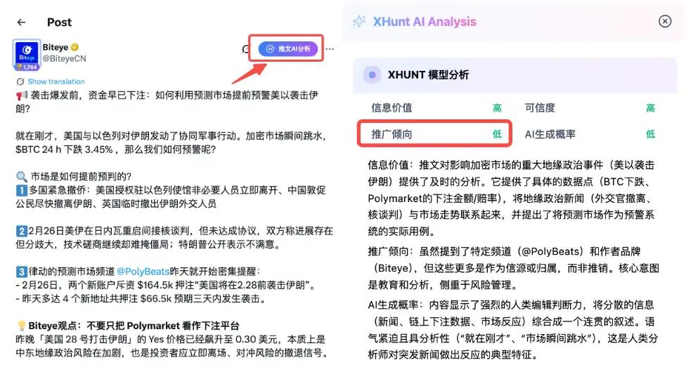 在官方运用 AI 强监管的当下,普通用户和运营者同样可以利用 AI 工具反侦察。借助 XHunt 的「推文 AI 分析」功能,可以通过 AI 生成推文的推广倾向报告。