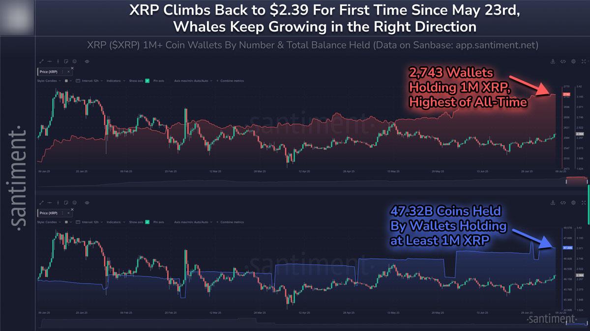 根据Santiment的数据,目前有2,743个钱包各持有超过一百万枚XRP,总计473.2亿枚代币——约占总流通供应量的4.4%。这种集中度缩紧了可用供应,助推了7月上半月50%的价格上涨。