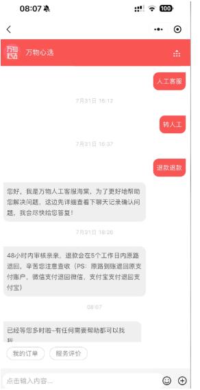 目前来说万物心选的app和小程序是可以找到人工的,在联系客服之后发人工几个字,就会有相关的人员联系你的。