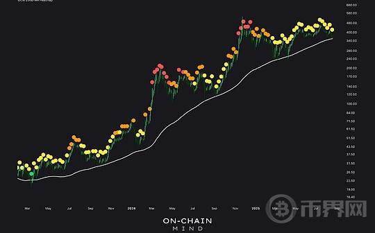 200日线图信号显示强势:MSTR 有望在本轮周期中第二次在 200 日线图上呈现绿色信号点,其交易价格处于 200 日均线 353 美元处。这一水平对多头而言是关键支撑位,标志着此轮涨势的开始。若能在此价位企稳,可能预示着强劲的上涨潜力。