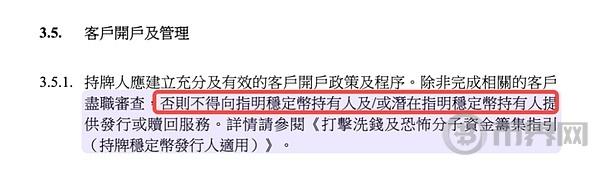 关键在于赎回服务的规定:「除非完成相关的客户尽职审查,否则不得向指明稳定币持有人及 / 或潜在指明稳定币持有人提供发行或赎回服务。」